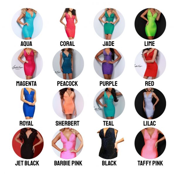 Make room for your new favorite dress! This cocktail features 4 way stretch lycra for easy movement and comfortability, with a plunging v neck bodice covered in sparkling crystals.