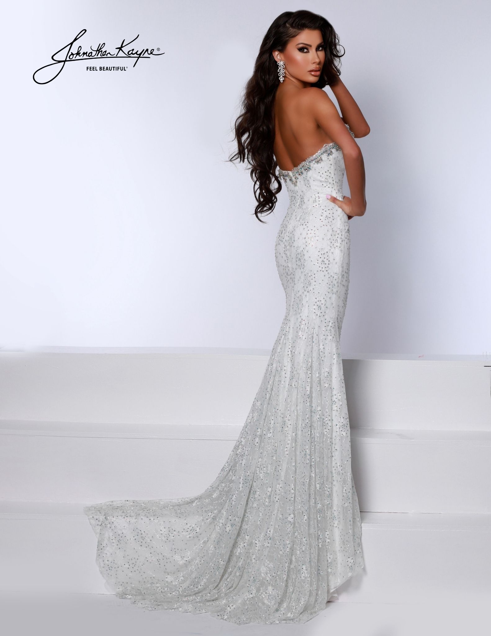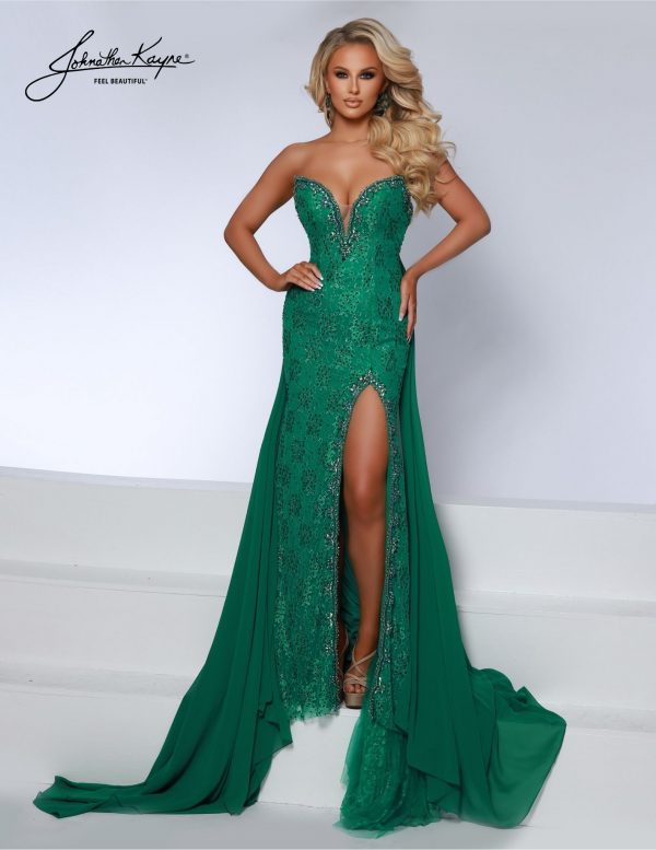 Dress up and show up at your next pageant! This strapless metallic stretch lace gown features a detachable cape for you to work the stage.