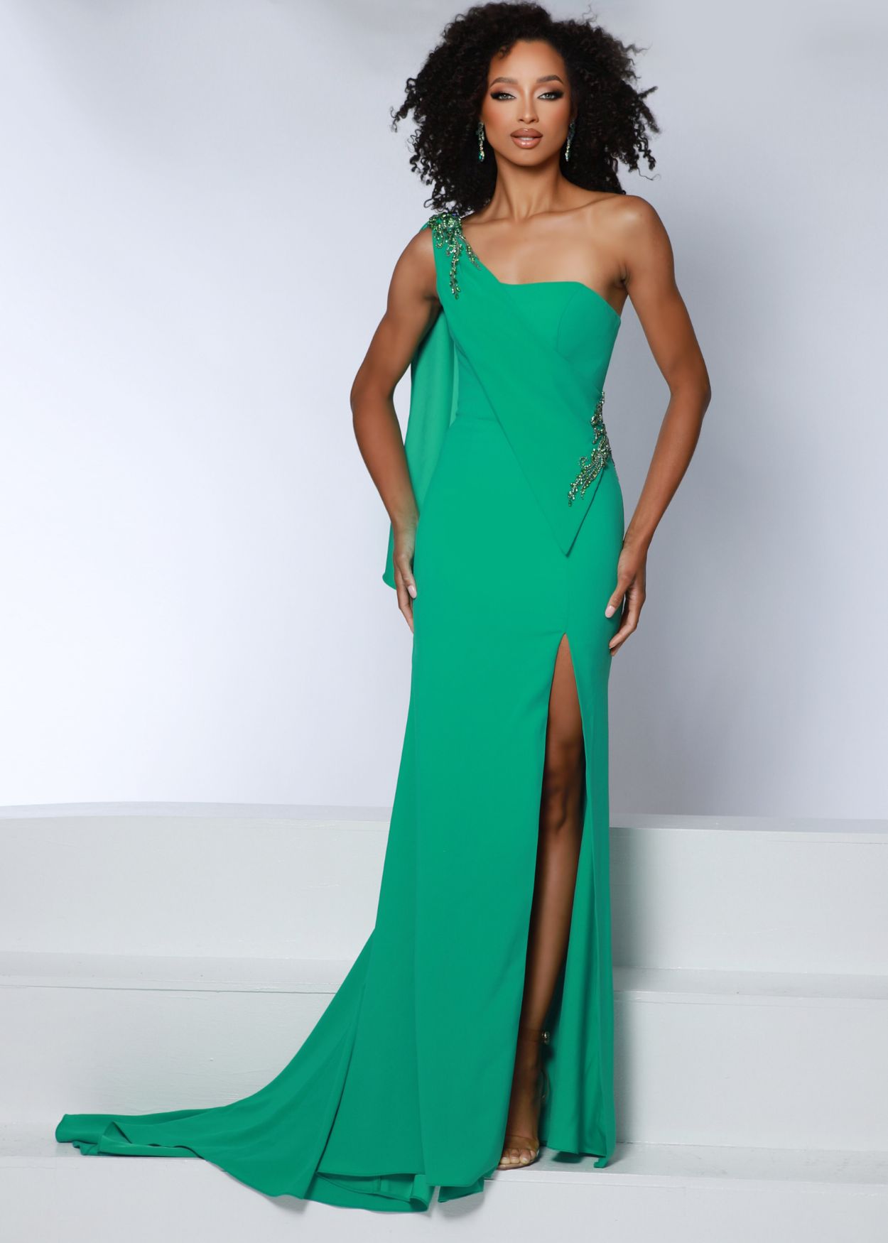 Get ready to take the crown in our one-shoulder stretch crepe gown. Adorned with stunning encrusted crystals on the one shoulder bodice and side, this gown is a regal masterpiece of style and grace. The slit adds an extra touch of allure.