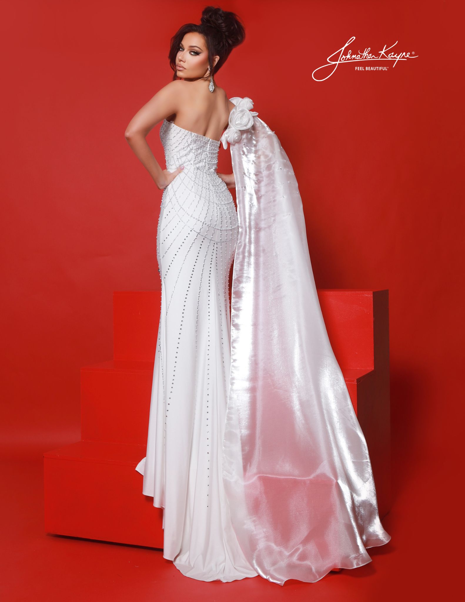 | Product Details | Elevate your presence in this one-shoulder 4-way stretch lycra fitted gown adorned with rhinestone and pearl beadwork, high slit, and a dramatic mirror organza one-shoulder rosette cape. |