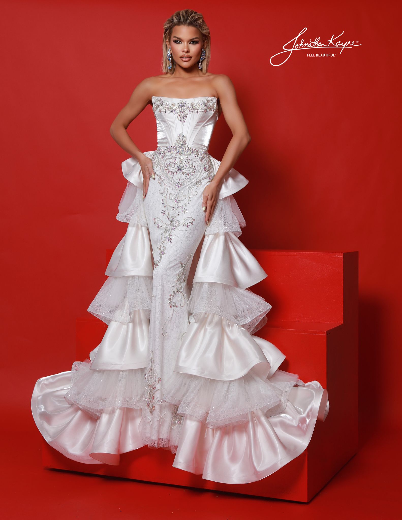 | Product Details | Beauty in motion – this strapless fitted shimmer satin and lace gown stuns with a scoop neckline, embellished beadwork details, corset bodice, and dramatic tiered overskirt. Ideal for pageants, homecoming court, couture, or high-fashion brides. |
