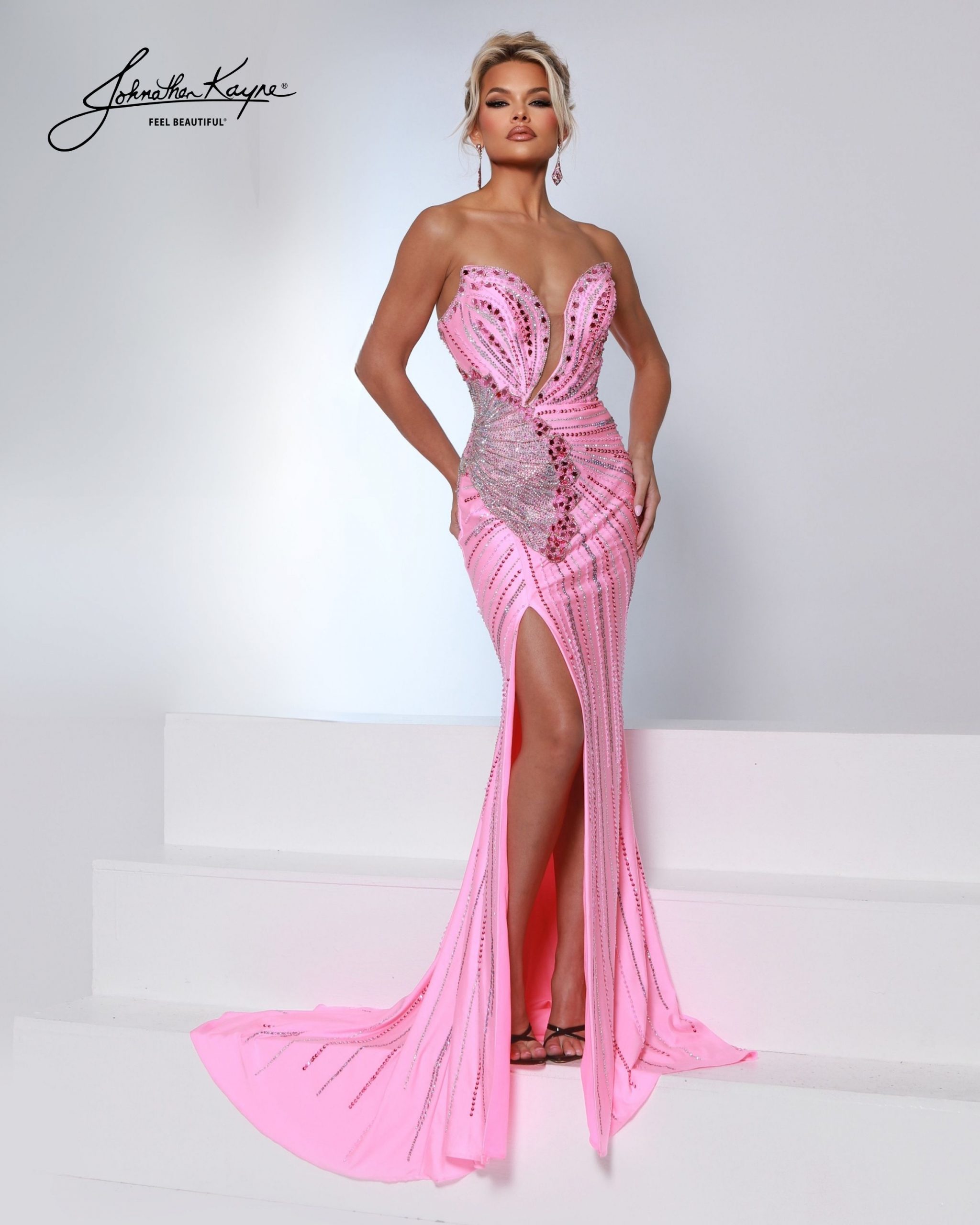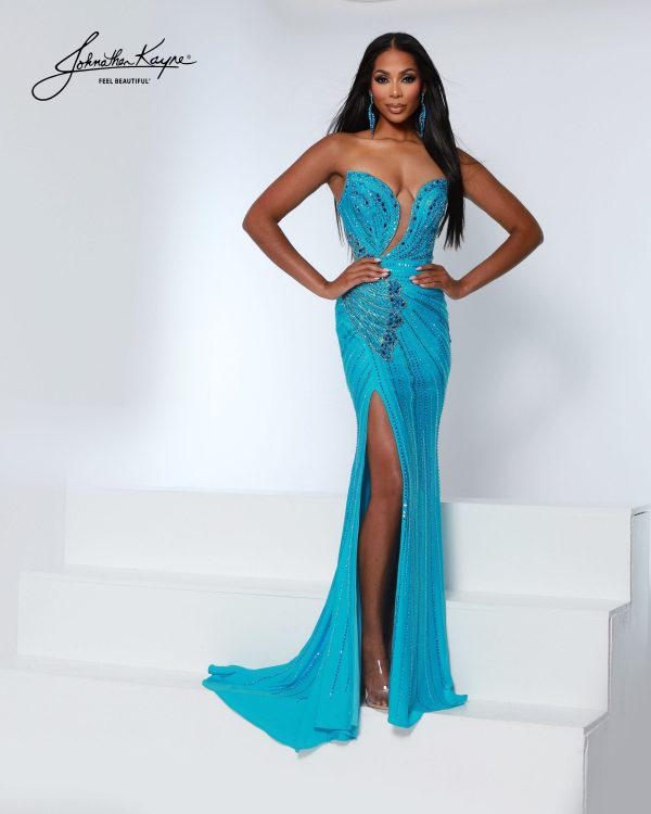| Product Details | Turn heads in this strapless beaded gown with a plunging neckline, sleek slit, and corset back for the perfect fit. The curve-hugging silhouette and radiant beadwork make it a show-stopper for pageant competition, prom night, or red carpet glamour. |