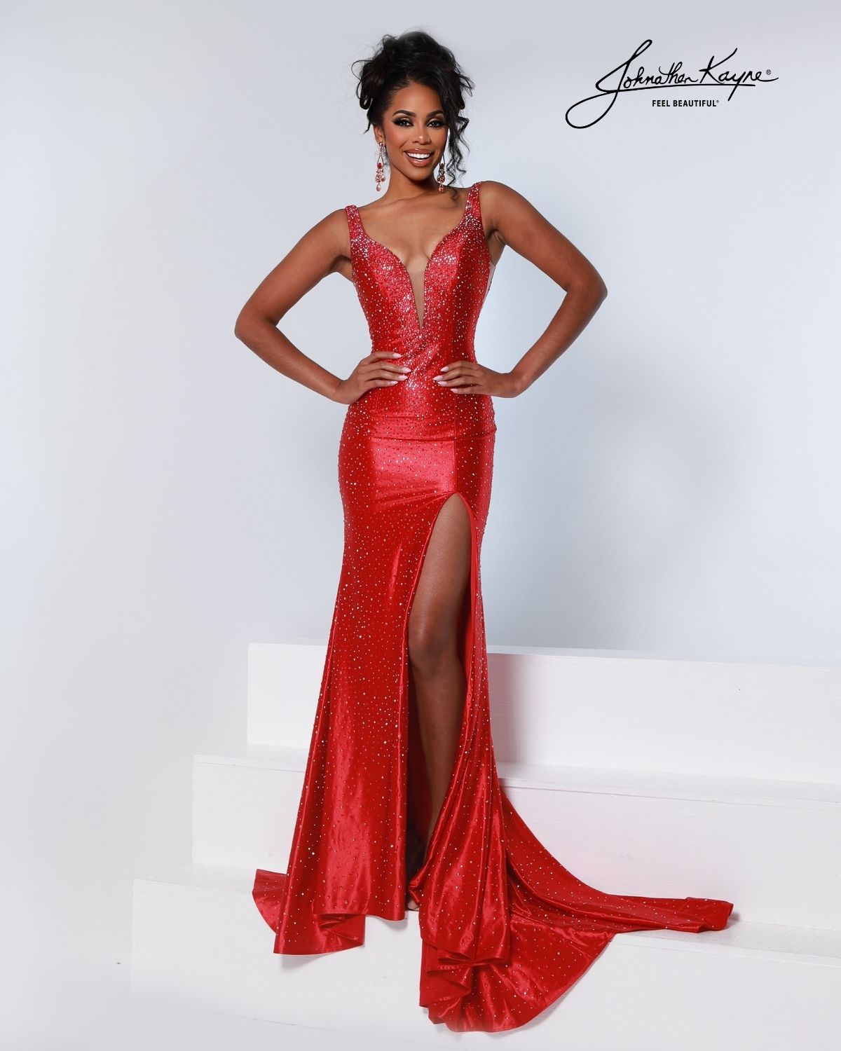 | Product Details | Dazzle under the lights in this fitted gown with a plunging neckline and high slit. Designed to sculpt every curve, this radiant look is ideal for prom night or a black-tie gala. |
