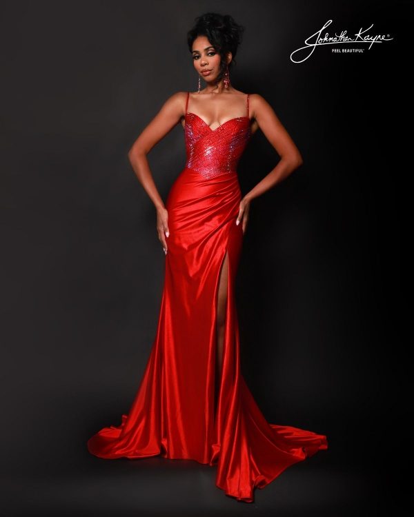 | Product Details | Turn heads in this sleek fit and flare gown featuring a sparkling two tone bodice, lace-up back, and thigh-high slit. The shiny stretch lycra and draped skirt make it a standout choice for prom, red-carpet entrances, or formal occasions. |