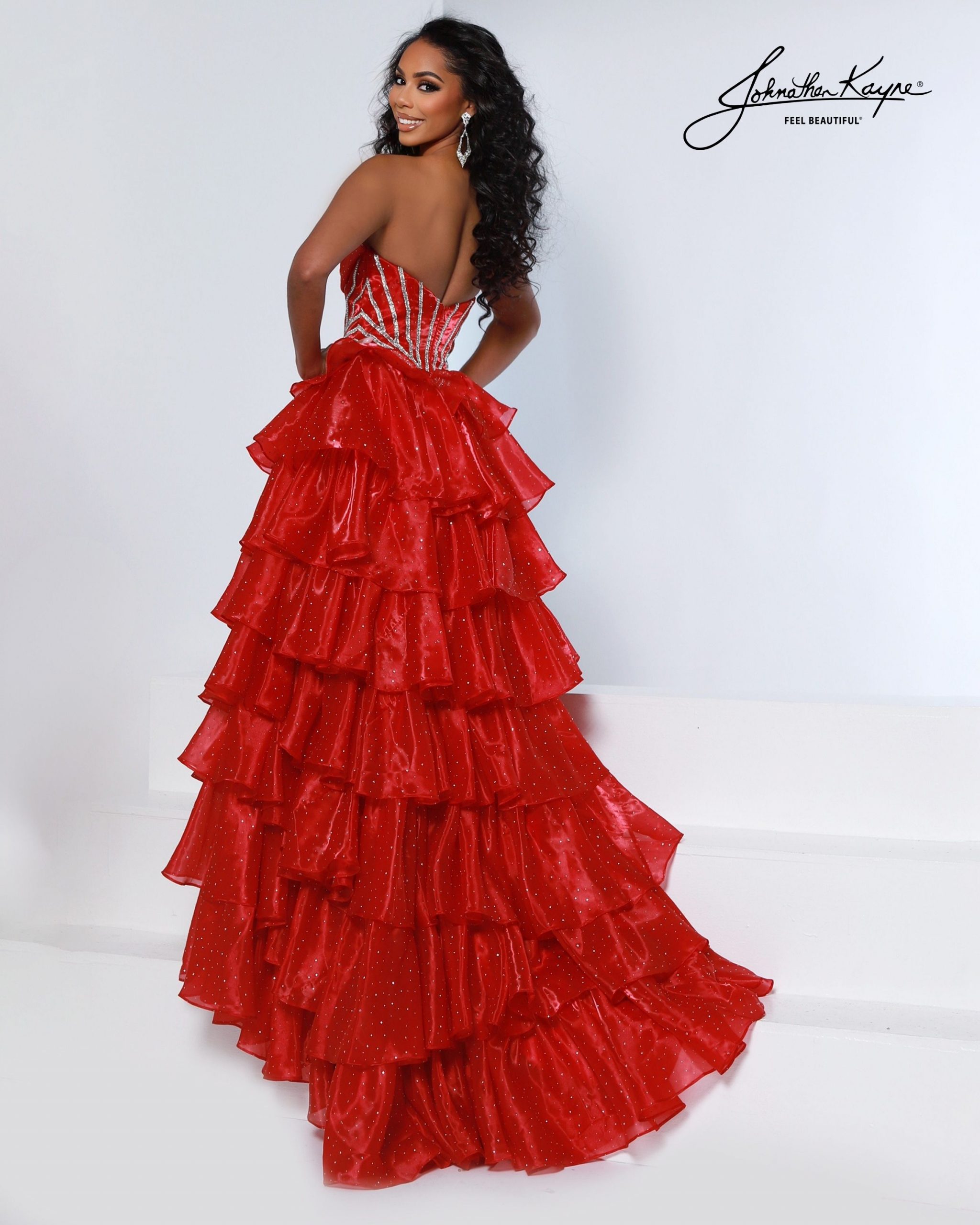 Bring the drama in this tiered mirror organza ballgown with a strapless crystal-detailed corset bodice. The playful tiered layers and thigh-high slit make it a dream dress for prom night, homecoming court, or teen pageant.