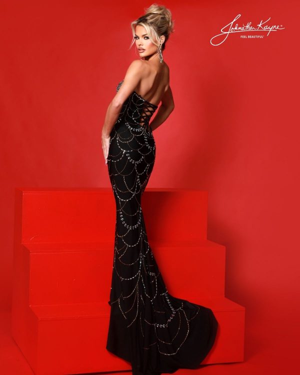 | Product Details | Old Hollywood meets modern glamour in this strapless, stretch lycra gown featuring cascading crystal scallops and a lace-up back. Ideal for prom, pageants, or any special night designed to shine. |