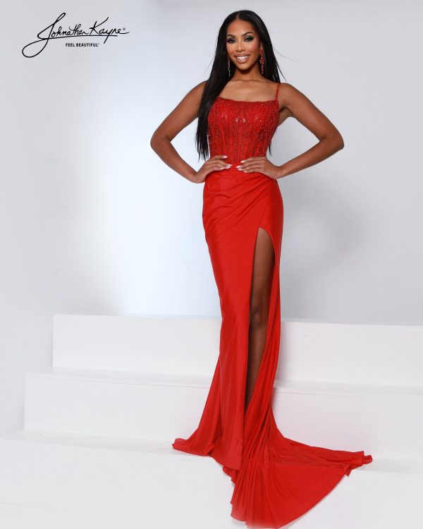 | Product Details | Steal the scene is this fitted stretch lycra gown with an intricately beaded bodice and flattering side slit. The ruched skirt detailing and timeless pearl and crystal sparkle create a stunning look for prom, red carpet, or elegant evening occasions. |