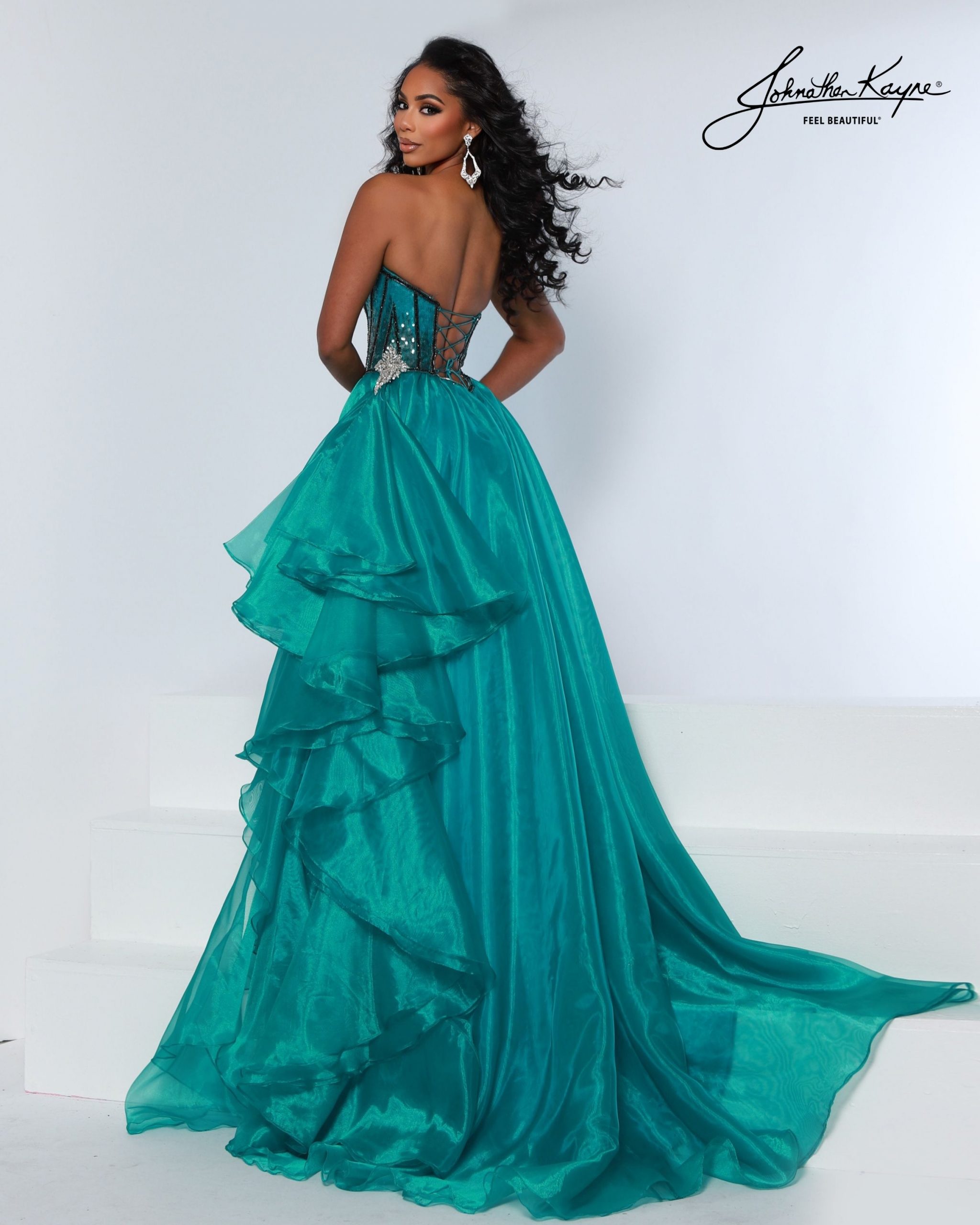 | Product Details | Ethereal elegance meets modern sparkle in this strapless ballgown. The sequin corset top with crystal details and layered skirt with detachable ruffle create a dreamy look, while the high slit adds edge. Perfect for prom, homecoming, or teen pageant. |