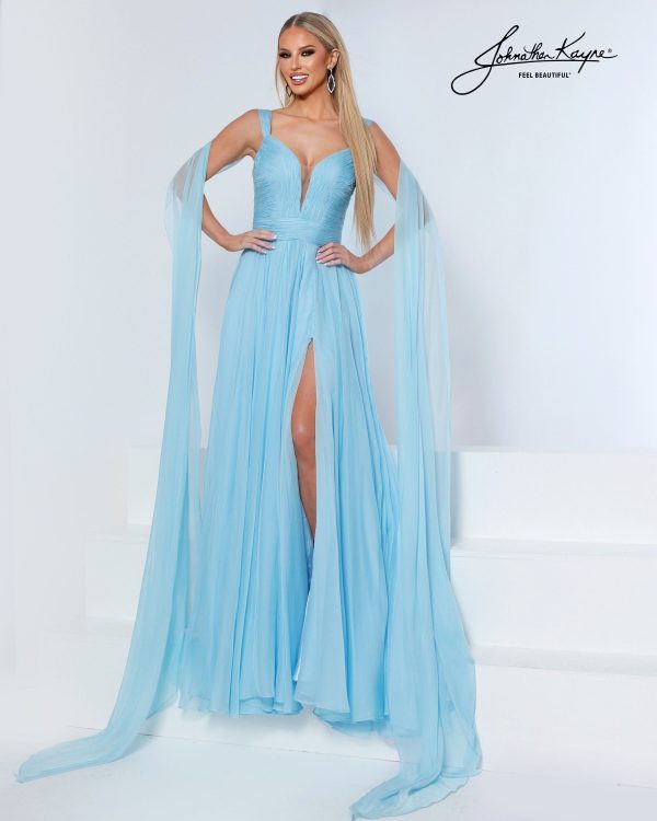 | Product Details | Step into your goddess era in this A-line gown with ruched shoulders & bodice, a deep neckline, and a daring slit. Flowing shoulder capes add ethereal elegance. Perfect for teen pageant evening wear or a modern bridal look. |