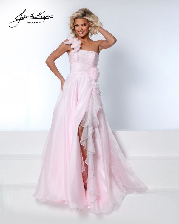 Live out your modern princess moment in this ballgown featuring floral accents, cascading ruffle slit, and a one-shoulder neckline made for the spotlight. A picture perfect choice for teen pageants, prom royalty, or a modern Cinderella moment.
