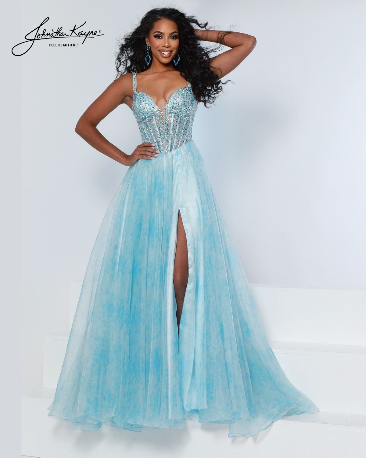 | Product Details | Light up the room in this dreamy printed poly organza ballgown adorned with crystal embellished exposed boning bodice, plunging neckline, defined waist, and daring slit. Ideal for red-carpet entrances or prom nights that call for pure sparkle. |