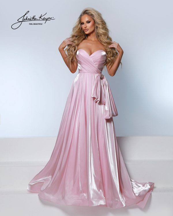 | Product Details | Soft yet stunning, this A-line gown radiates red-carpet shine with a strapless sweetheart neckline, pleated bodice, and draped side sash. The luminous liquid metal finish catches every light, perfect for evening events or special occasions. |