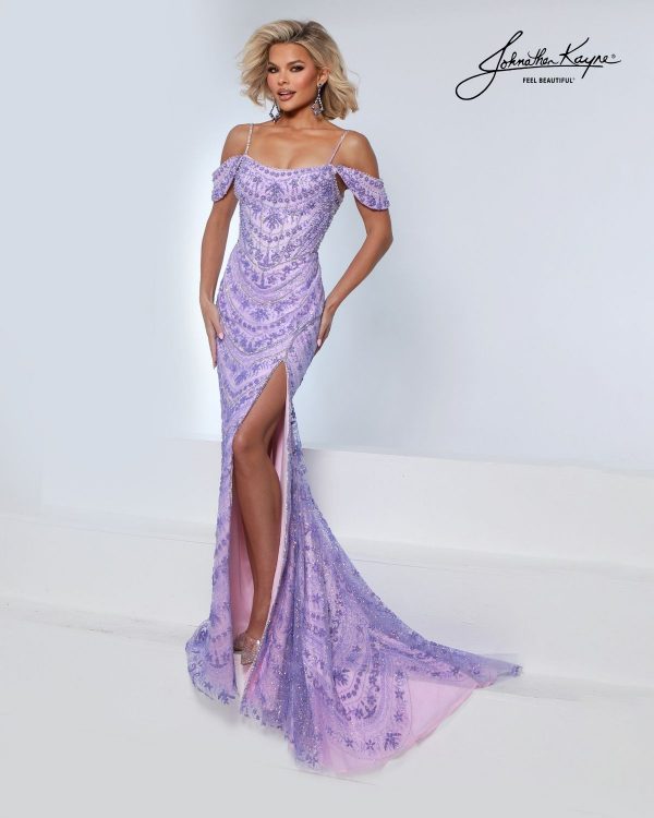 Grace the spotlight in this fit and flare gown with off-the-shoulder drapes and intricate beaded embroidery. The flattering fit and slit blend romance with confidence. Ideal for prom, galas, or special occasions.