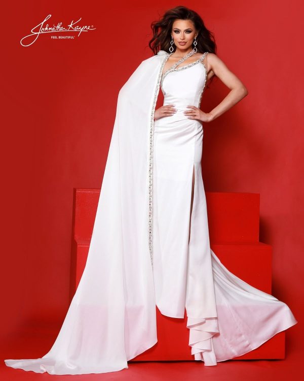 | Product Details | Make them stop & stare in this own featuring crystal-trimmed edges and a daring thigh-high slit. A dramatic detachable cape drapes effortlessly over one shoulder for flair. With a low open back, this gown is made for the pageant stage or red carpet. |