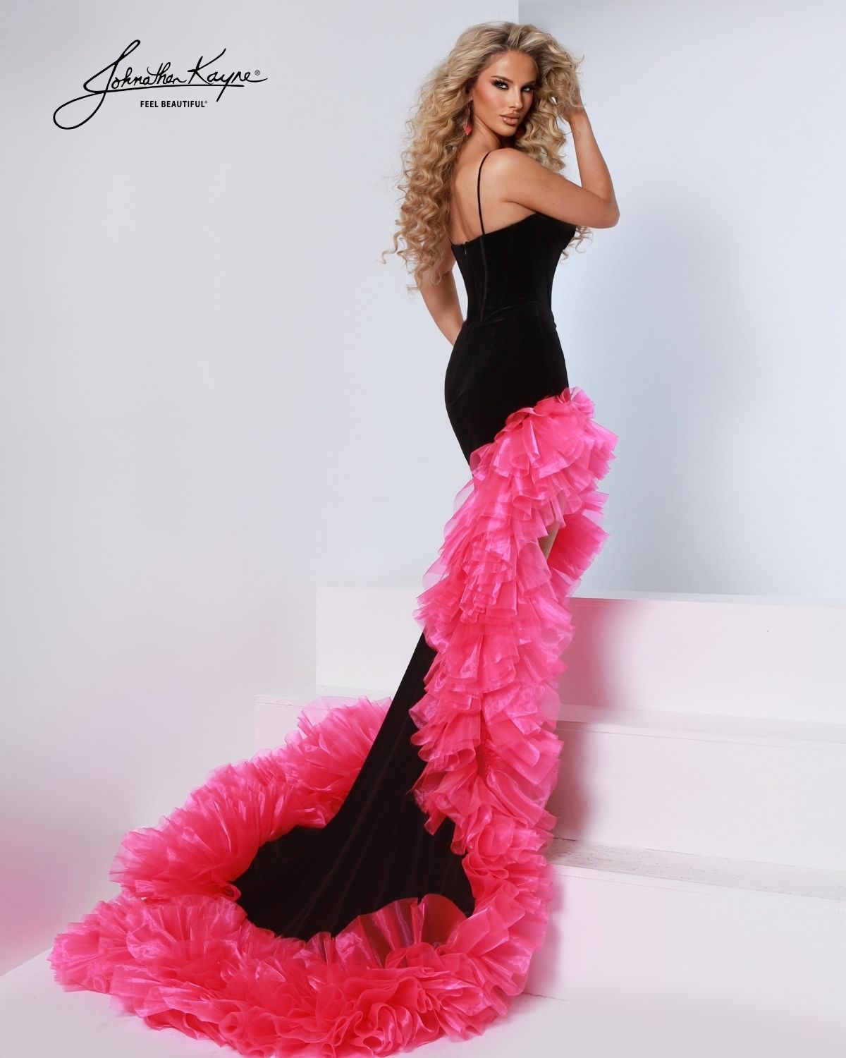 | Product Details | Bring the drama in this stretch velvet gown with bold organza ruffle trim. The fitted corset bodice, detachable boa, and high slit exude confidence, while the cascading ruffle train adds show-stopping glamour—perfect for pageants or photoshoots. |