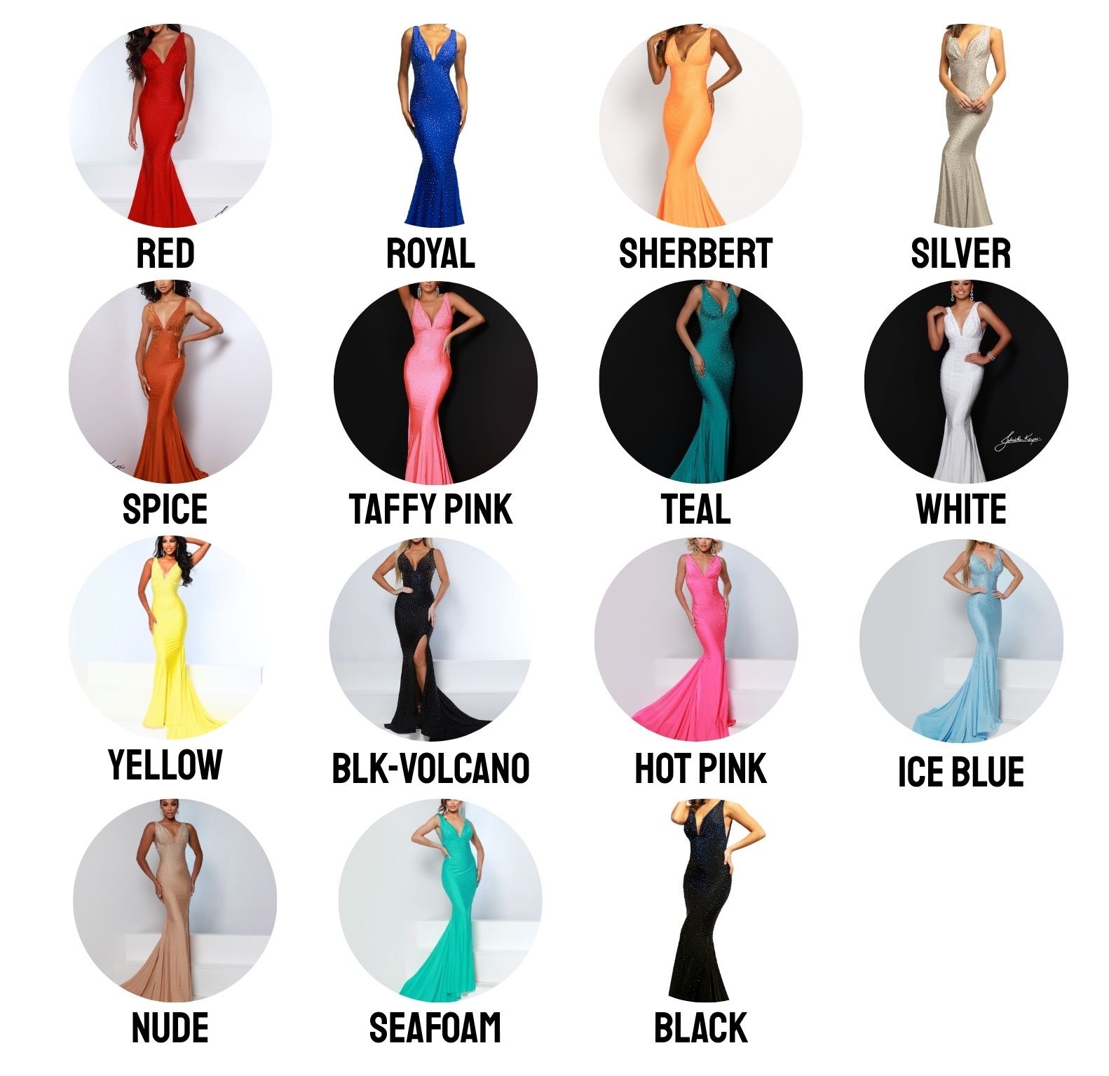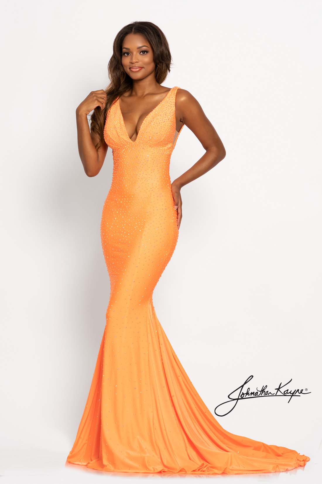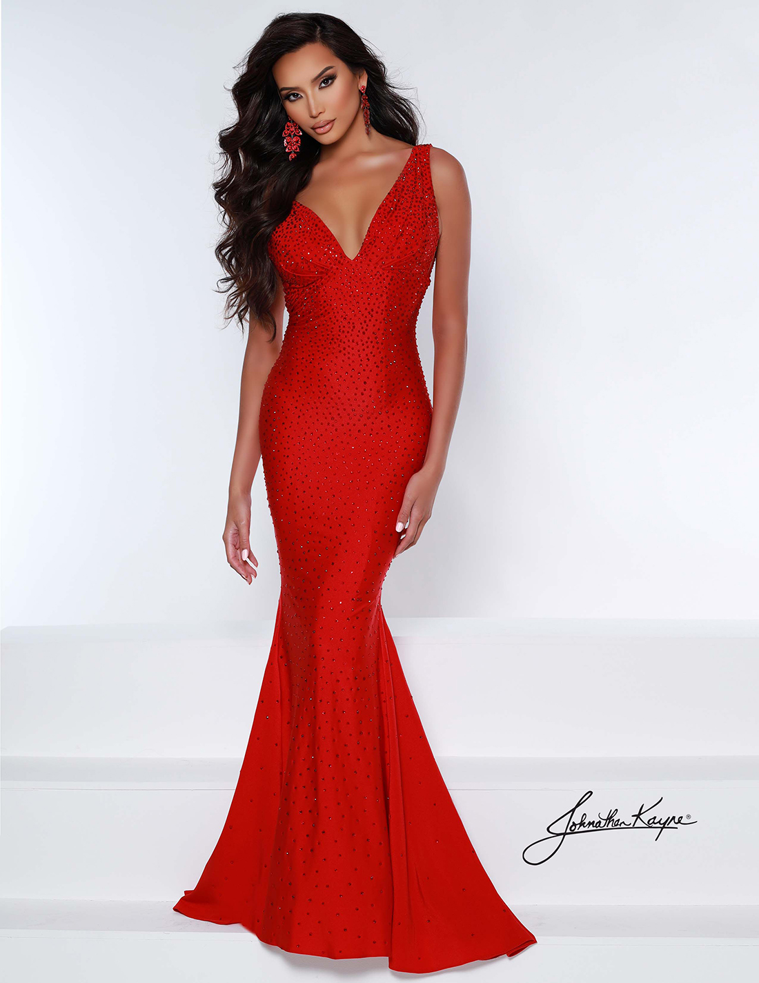 | Product Details | One of Johnathan Kayne's favorite styles for the Fall season, this elegant 4 way stretch lycra gown has a modern empire bodice and hugs the body all the way to the dramatic train. Adorn in shimmering crystals, this gem of a gown will turn heads. |