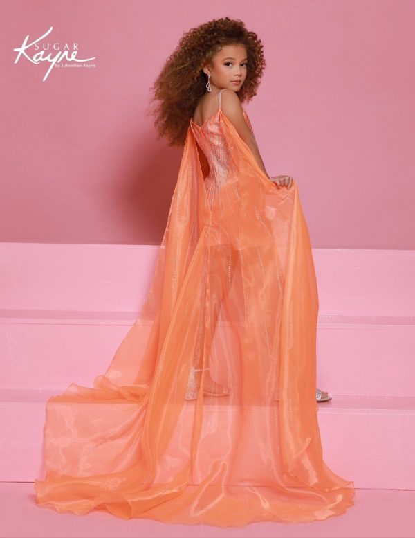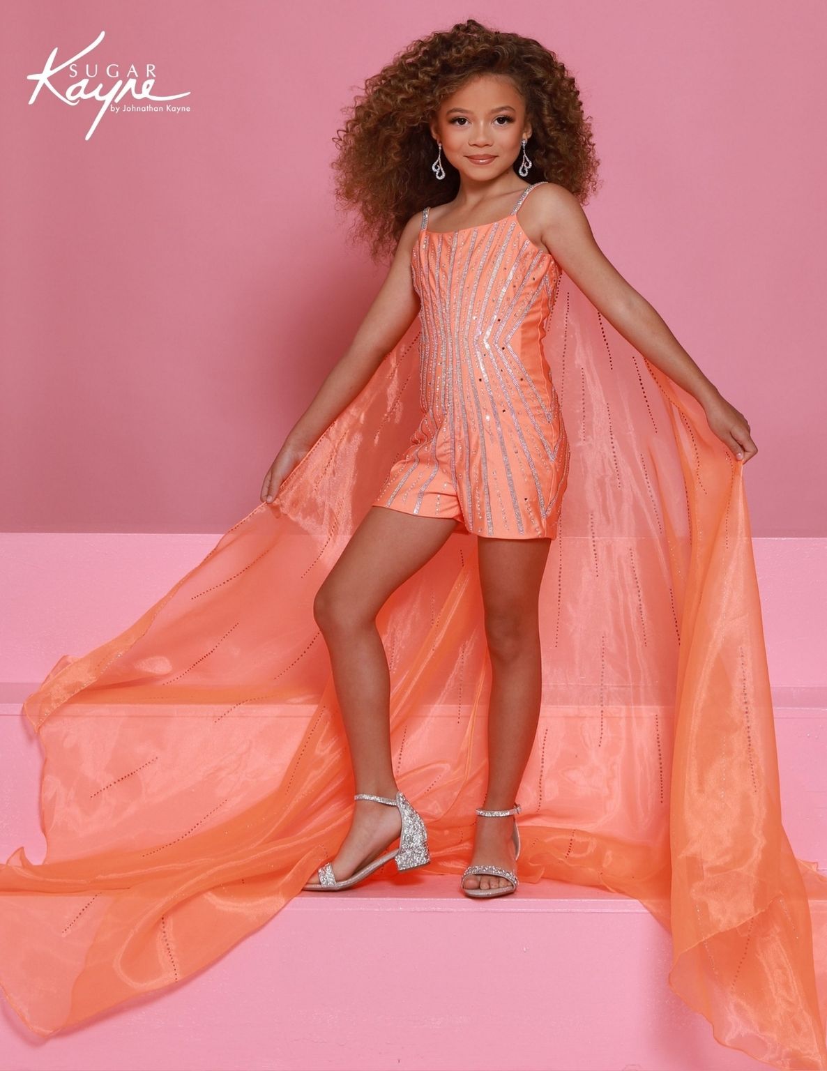 | Product Details | Command attention on the stage in this stretch Lycra fun-fashion romper with crystal embellishments. The poly organza cape flows with every step creating a confident yet playful moment on stage. |